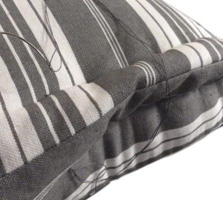 Choisir sa propre matière permet aussi de décider de la quantité. Elle avait choisi de la toile à matelas grise et des liberty. La mousse de coussin spécialisée est plus adéquat pour faire un bon coussin et cela na revient pas beaucoup plus cher qu'une autre matière. Nous pouvons rénover ou créer vos coussins pour vos espaces de détente.